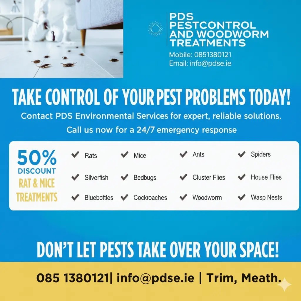 PDSE Pest Control Services PDSE Pest Control, your local expert for pest control and woodworm treatments throughout Dunboyne & Trim, Co. Meath, and surrounding areas like Navan and Dunshaughlin. We provide affordable, reliable 24/7 pest control on call for domestic customers, covering everything from termite treatment, bed‑bugs treatment, wasp nest removal, silverfish removal, rodent control, and cockroach removal to general pest control in Kells, athboy,trim,ratoath, dunboyne. Our eco‑friendly solutions are child‑ and pet‑safe, giving you peace of mind while we eliminate pests and prevent future infestations. What sets us apart is our commitment to keeping your family and pets safe.